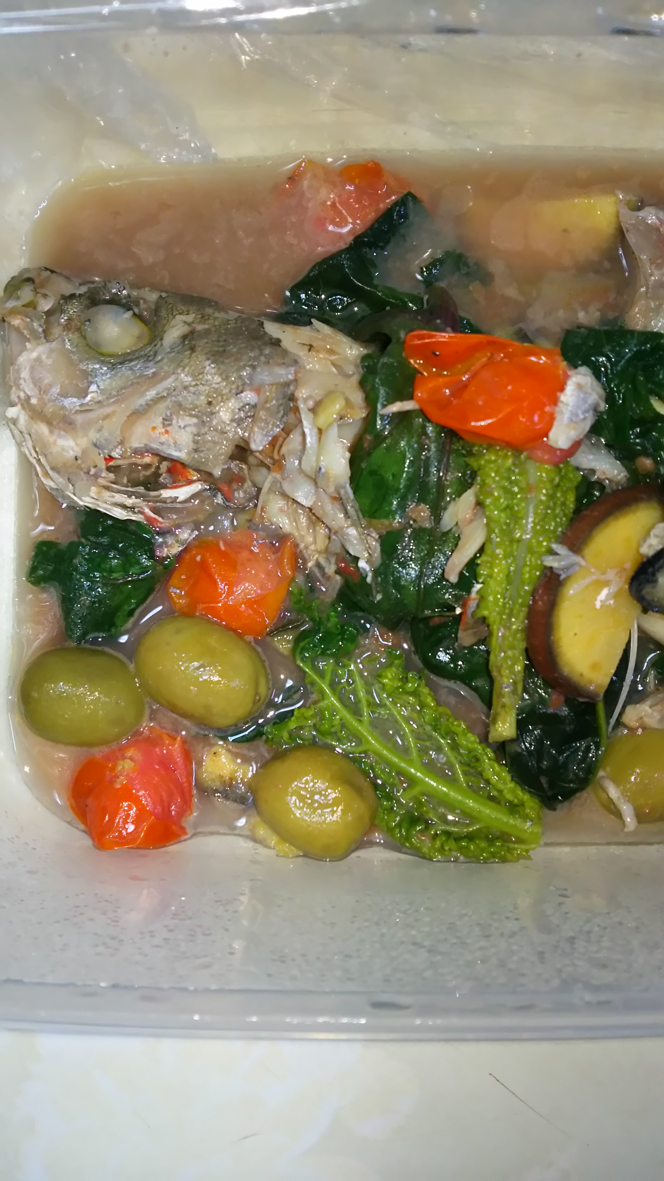 (アクアミネラーレで食べる三角シェフの最後の料理。欲張ってパスタを3種類も食べたら、メインのアクアパッツアが、半分食べたところでく・苦しい・・・。キレイにお持ち帰りにしてくれました。三角シェフも愛があるなぁ。)